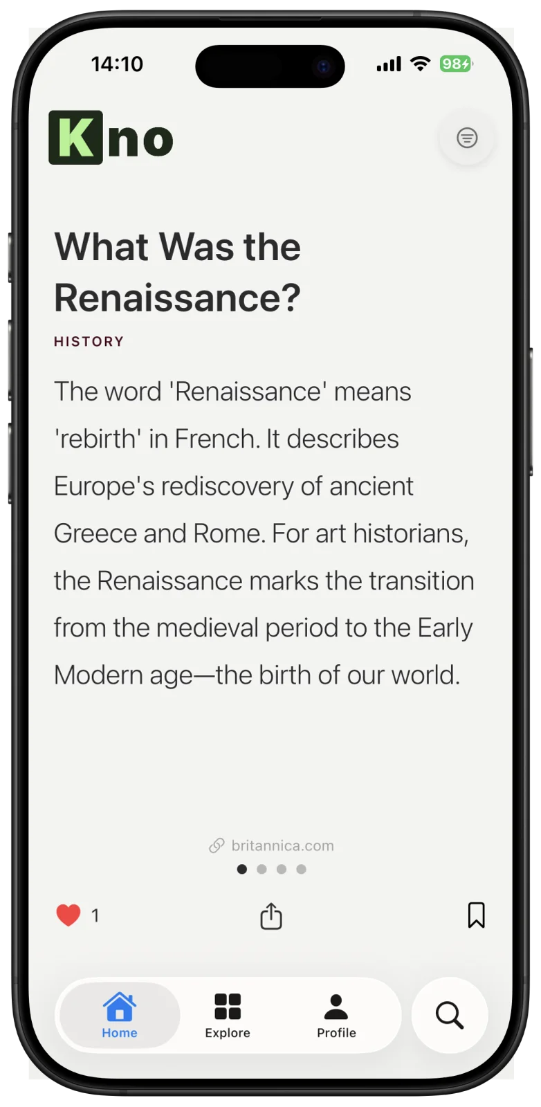 No random internet claims. No “a study says” without saying which one. Every card in Kno links directly to its source — and we only use sources you’d trust with your health, your money, or your understanding of the universe.